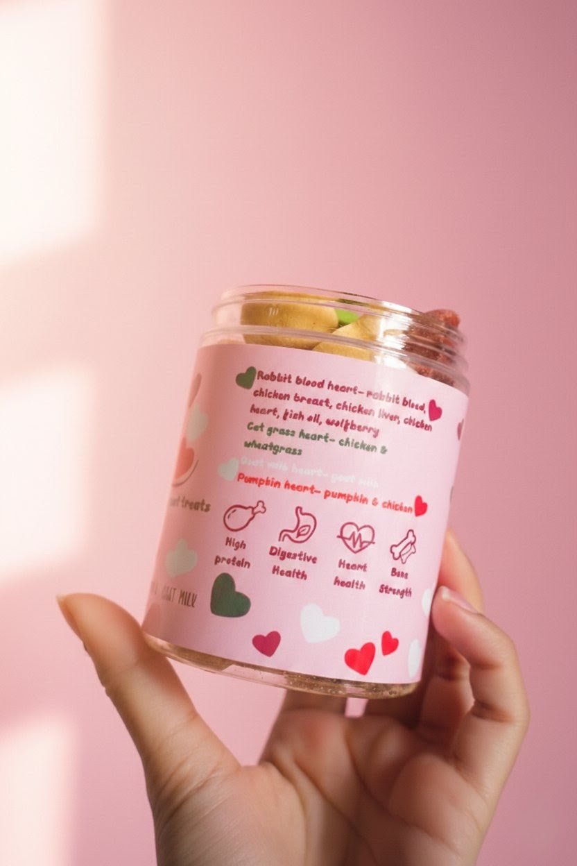 ​Our Jar of Hearts is a curated collection of artisanal, freeze-dried treats designed for the feline who deserves more than just a standard snack. Each jar contains 40 pieces of heart-shaped goodness, blending high-quality proteins with functional superfoods to keep your kitty purring with health.